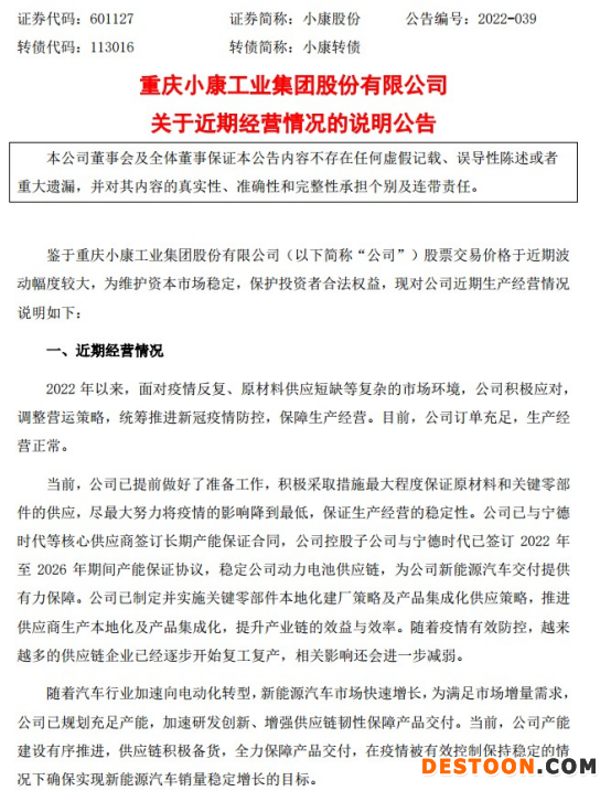 4月26日晚,小康股份公告称,2022 年以来,面对疫情反复、原材料供应短缺等复杂的市场环境,公司积极应对,调整营运策略,统筹推进新冠疫情防控,保障生产经营。目前,公司订单充足,生产经营正常。