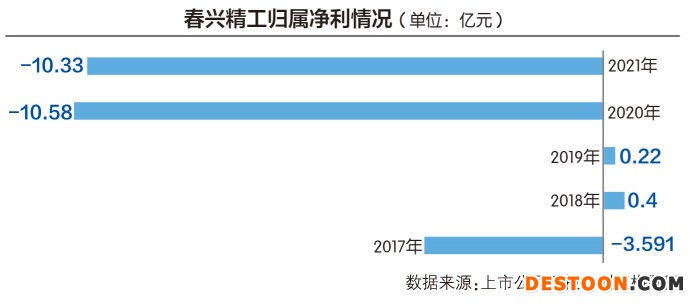 4月26日,春兴精工(002547,SZ;昨日收盘价2.88元)发布了2021年年报,公司实现营业收入26.73亿元,同比下降48.12%,归母净利润为亏损10.33亿元,而在2020年公司就已亏损10.58亿元。