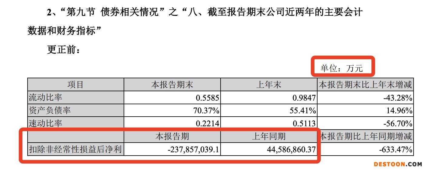 至于《2021年年度报告》《2021年年度报告摘要》,则共计出现3处更正。其中,“收入与成本”一节,单位由“万元”统一为“元”;“截至报告期末公司近两年的主要会计数据和财务指标”“在年度报告批准报出日存续的债券情况”两节中,本报告期、上年同期扣除非经常性损益后净利润由“-237,857,039.1万元”“44,586,860.37万元”,分别更正为“-23,785.70万元”“4,458.69万元”。