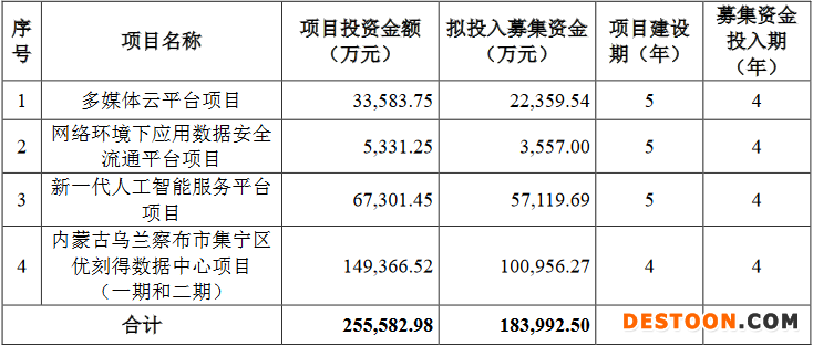 优刻得本次募集资金总额为19.44亿元,扣除发行费用后,募集资金净额为18.40亿元,分别多媒体云平台项目、网络环境下应用数据安全流通平台项目、新一代人工智能服务平台项目和内蒙古乌兰察布市集宁区优刻得数据中心项目(一期和二期)。