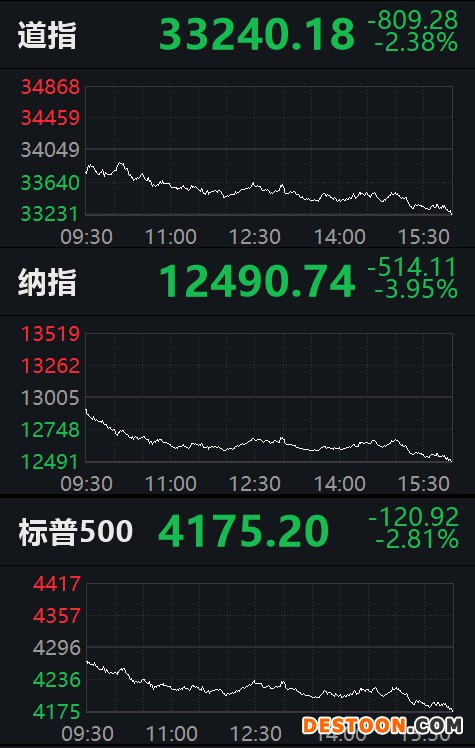 中新经纬4月27日电 美东时间周二,美股三大指数全线下跌,道指跌2.38%,报33239.45点;纳指跌3.95%,报12490.74点;标普500指数跌2.81%,报4175.21点。法拉第未来多次触发熔断,盘中跌超41%。