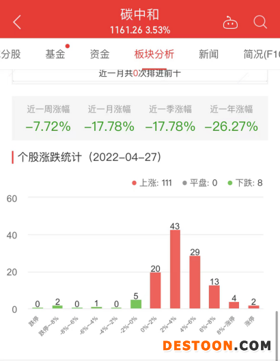 中国经济网北京4月27日讯 今日,碳中和板块整体涨幅3.53%,其中111只股票上涨,8只股票下跌。