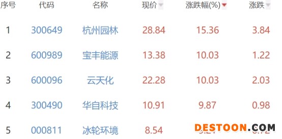 其中,杭州园林、宝丰能源、云天化、华自科技、冰轮环境位列板块涨幅前五位,涨幅分别为15.36%、10.03%、10.03%、9.87%、9.21%。
