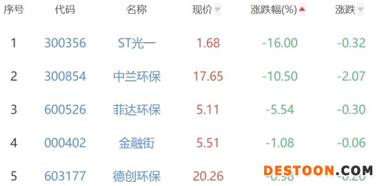 ST光一、中兰环保、菲达环保、金融街、德创环保位列涨幅榜后五位,涨幅分别为-16.00%、-10.50%、-5.54%、-1.08%、-0.98%。
