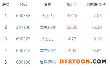 天士力、西点药业、大东方、南宁百货、复星医药位列涨幅榜后五位,涨幅分别为-7.03%、-6.30%、-6.10%、-5.84%、-5.72%。
