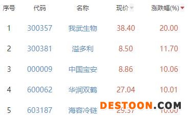其中,我武生物、溢多利、中国宝安、华润双鹤、海容冷链位列板块涨幅前五位,涨幅分别为20.00%、11.70%、10.06%、10.01%、10.00%。