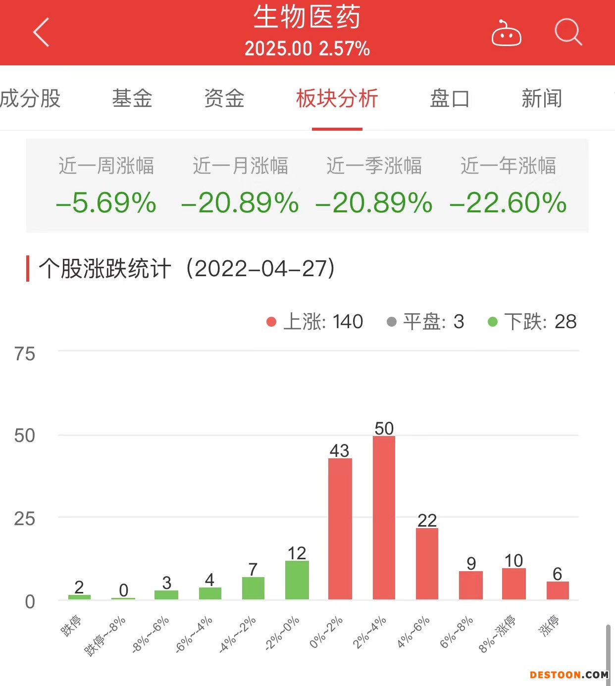 中国经济网北京4月27日讯 今日,生物医药板块整体涨幅2.57%,其中140只股票上涨,3只股票平盘,28只股票下跌。