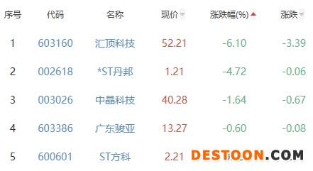 汇顶科技、*ST丹邦、中晶科技、广东骏亚、ST方科位列板块涨幅榜后五位,涨幅分别为-6.10%、-4.72%、-1.64%、-0.60%和0.00%。