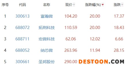 其中,富瀚微、拓荆科技、宏微科技、纳芯微和圣邦股份位列板块涨幅榜前五位,涨幅分别为20.00%、20.00%、12.02%、11.94%和11.33%。