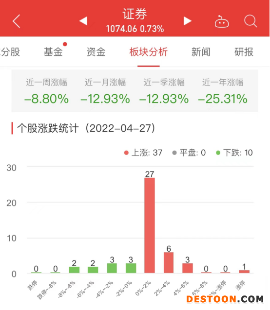 中国经济网北京4月27日讯 今日,证券板块整体涨幅0.73%,其中37只股票上涨,0只股票平盘,10只股票下跌。