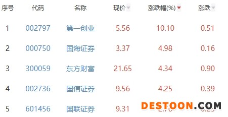 其中,第一创业、国海证券、 东方财富、国信证券和国联证券位列板块涨幅榜前五位,涨幅分别为10.10%、4.98%、4.34%、4.25%和2.76%。