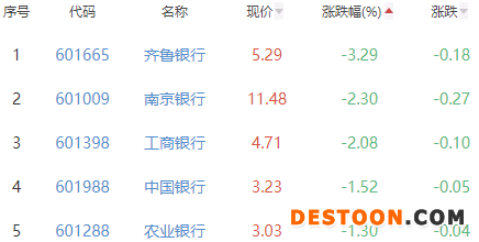 齐鲁银行、南京银行、工商银行、中国银行和农业银行位列板块涨幅榜后五位,涨幅分别为-3.29%、-2.30%、-2.08%、-1.52%和-1.30%。
