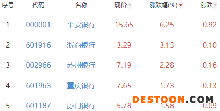 其中,平安银行、浙商银行、苏州银行、重庆银行和厦门银行列板块涨幅榜前五位,涨幅分别为6.25%、3.13%、2.28%、1.73%和1.58%。