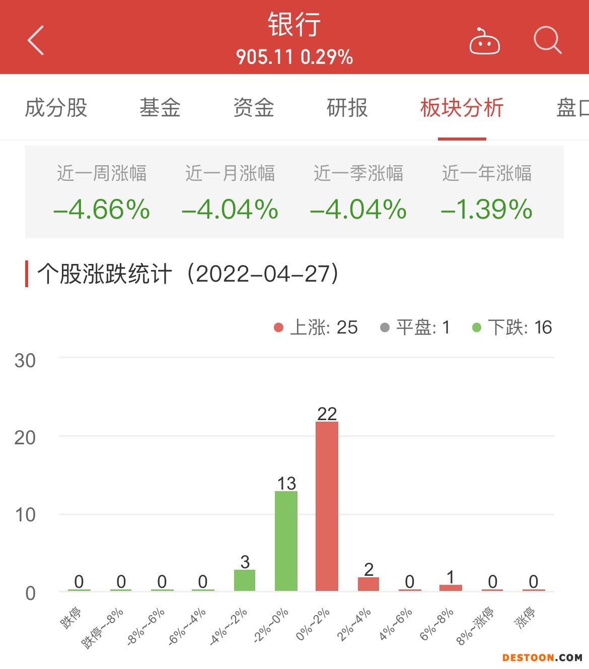 中国经济网北京4月27日讯 今日,银行板块整体涨幅0.29%,其中25只股票上涨,1只股票平盘,16只股票下跌。