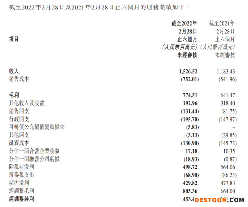 2022财年前六个月销售成本7.52亿元,毛利7.74亿元,较上年同期增加20.7%。费用方面,销售开支1.31亿元,行政开支1.95亿元,其他开支313万元。可转债公允价值变动损失583万元。