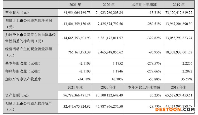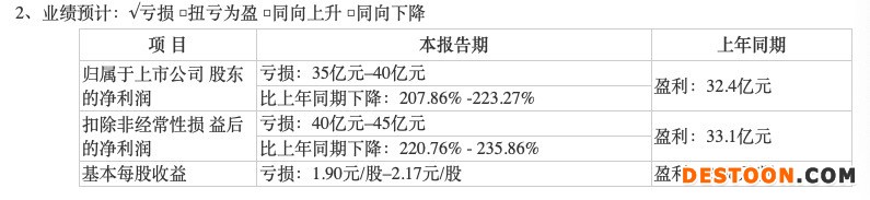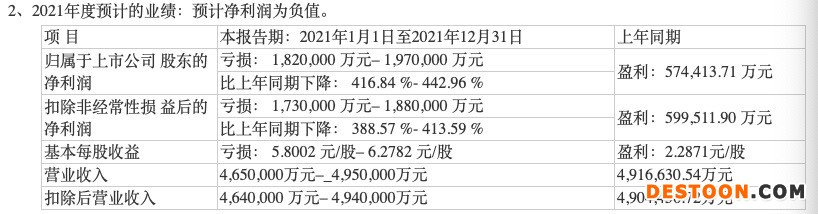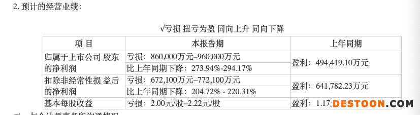 根据1月26日业绩预告,去年全年,新希望归属于上市公司股东的净利润亏损为86 亿元–96 亿元,比上年同期下降273.94%-294.17%;扣非后归属股东的净利润亏损为67 亿元–77 亿元,同比下滑204.72% - 220.31%。基本每股收益亏损为2.00元/股–2.22元/股。