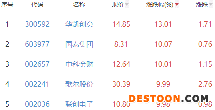 其中,华凯创意、国泰集团、中科金财、歌尔股份和联创电子位列板块涨幅榜前五位,涨幅分别为13.01%、10.07%、10.01%、9.99%和9.98%。