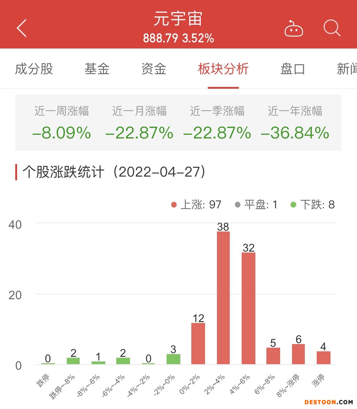 中国经济网北京4月27日讯 今日,元宇宙板块整体涨幅3.52%,其中97只股票上涨,1只股票平盘,8只股票下跌。