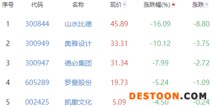 山水比德、奥雅设计、德必集团、罗曼股份和凯撒文化位列板块涨幅榜后五位,涨幅分别为-16.09%、-10.12%、-7.99%、-5.24%和-4.50%。