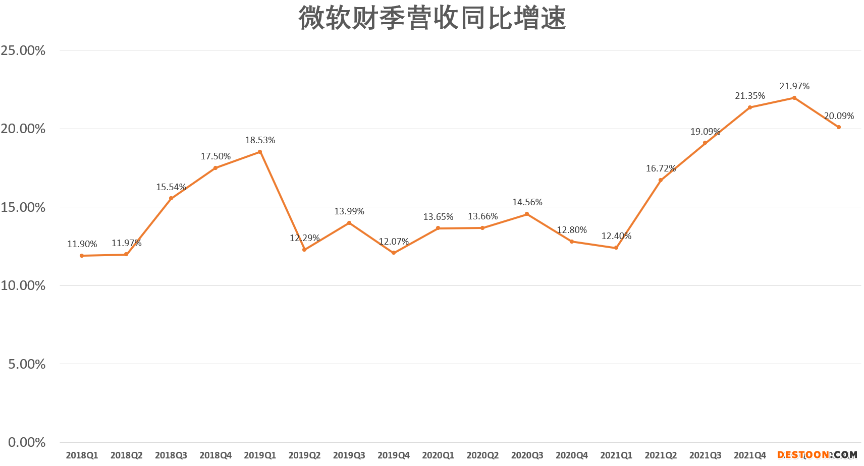 另一个可能会令投资者失望的数据是微软本季度的利润增速。目前华尔街预期的调整后EPS为2.18美元,同比增长11.8%。虽然这个数字本身不差,但考虑到公司从2018财年Q3财季开始的16个财季中,除了3个季度外,其余季度的EPS增速区间一直处于20-35%之间。22年第三财季的利润增速显然也将是公司过去几年来的低点。