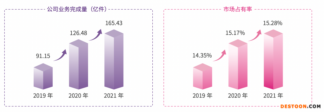 在过去三年间,圆通的市占率和公司业务完成量也在持续上涨。2019年到2021年,圆通的市场占有率分别为14.35%、15.17%和15.28%,与此同时,业务完成量分别为91.15亿件、126.48亿件和165.43亿件。