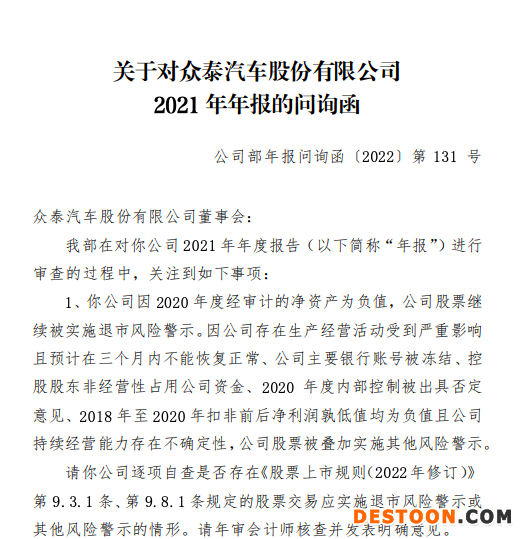 4月26日,深交所上市公司管理二部向*ST众泰发出《2021年年报的问询函》,要求*ST众泰结合截至目前公司未决诉讼、仲裁的涉案金额等案件情况、公司存在“生产经营活动受到严重影响且预计在三个月内不能恢复正常”的情形、公司主营业务盈利能力等方面,充分说明公司持续经营能力是否存在不确定性,并请年审会计师核查说眀公司2020年度与持续经营相关的重大不确定性所涉事项影响是否消除。
