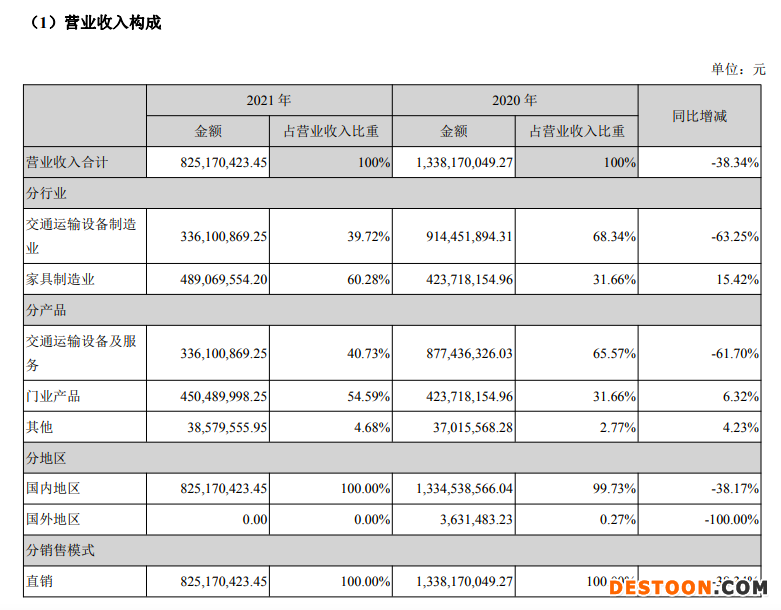 报告显示,2021年,*ST众泰营业收入主要由交通运输设备制造业和家具制造业两部分收入组成。其中,2021年,其家具制造业营业收入约4.89亿元,营收占比为60.28%;交通运输设备制造业营业收入约3.36亿元,营收占比为39.72%。