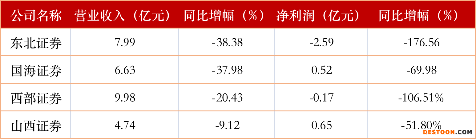 4月27日晚间,东北证券、国海证券、西部证券、山西证券相继公布2022年一季度业绩情况。报告期内,上述券商营收、净利润均大幅下滑,其中两家券商出现亏损。