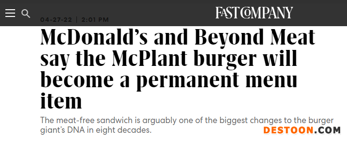 于是,《Fast Company》将这篇报道的标题取为“麦当劳与Beyond Meat称McPlant汉堡将会成为菜单上的常驻单品”。《Fast Company》是美国最具影响力的商业杂志之一,与《财富》和《商业周刊》齐名。