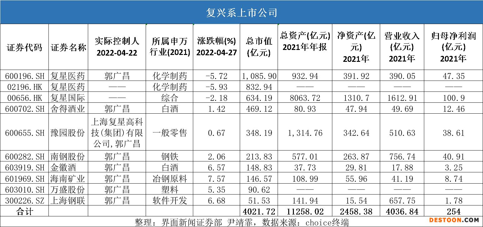 值得注意的是,“复星系”9家上市公司在A股和港股上的市值超4000亿元。截至4月27日除万盛股份未披露2021年年报,其余8家均已披露战绩,8家上市公司202年总资产已超万亿元、净资产近2460亿元,2021年营收合计达4036亿元,归母净利合计达254亿元。