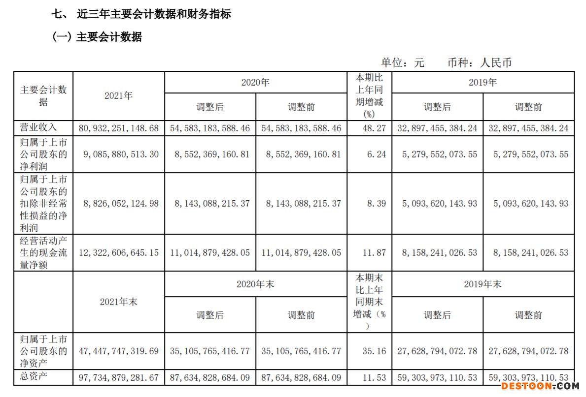 27日晚间,隆基股份披露2021年年度报告显示,全年实现营业收入809.32亿元,同比增长48.27%;归属于上市公司股东净利润90.86亿元,为历史新高,同比增长6.24%;扣非后净利润88.26亿元,同比增长8.39%;基本每股收益1.69元。