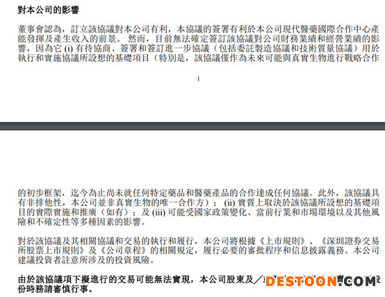 其中还提及,山东新华制药和河南真实生物科技有限公司达成的协议具有非排他性,本公司并非真实生物的唯一合作方;实质上取决于该协议所设想的基础项目的实际实施和推广(如有);及可能受国家政策变化、当前行业和市场环境以及其他风险和不确定性等多种因素的影响。