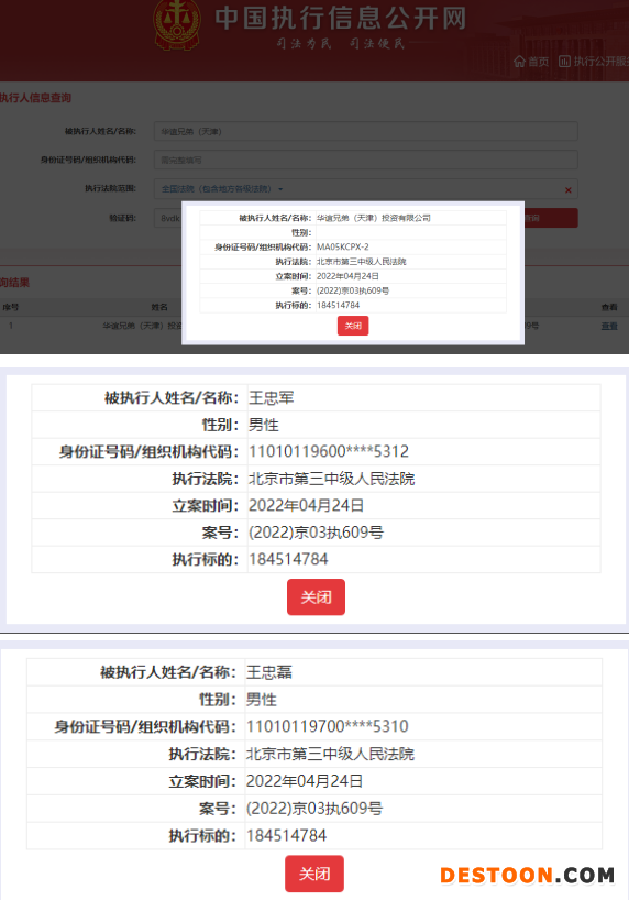 中国网科技4月28日讯(记者 柏林)据中国执行信息公开网显示,华谊兄弟(天津)投资有限公司、王忠军、王忠磊等近日新增一条被执行人信息,执行标的约1.85亿元,执行法院为北京市第三中级人民法院,案号为(2022)京03执609号。