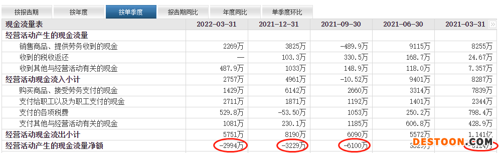 自去年以来5个季度,富吉瑞仅去年二季度末经营活动产生的现金流量净额为正,其余4个季度均为负。截至2021年3月末、6月末、9月末、12月末及2022年3月末,富吉瑞经营活动产生的现金流量净额分别为-3124万元、3829万元、-6100万元、-3229万元、-2994万元。
