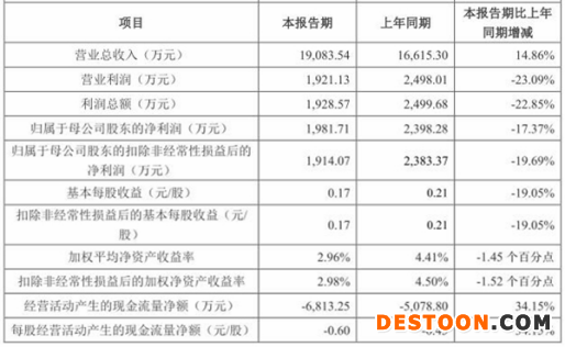 2022年1-3月,公司营业收入为19,083.54万元,同比增长14.86%;归属于母公司股东的净利润1,981.71万元,同比减少17.37%;归属于母公司股东的扣除非经常性损益后的净利润1,914.07万元,同比减少19.69%;经营活动产生的现金流量净额-6,813.25万元,上年度期末为-5,078.80万元。