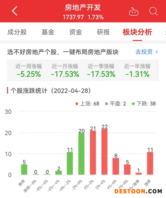 中国经济网北京4月28日讯 今日,房地产开发板块整体涨幅1.73%,其中68只股票上涨,2只股票平盘,38只股票下跌。