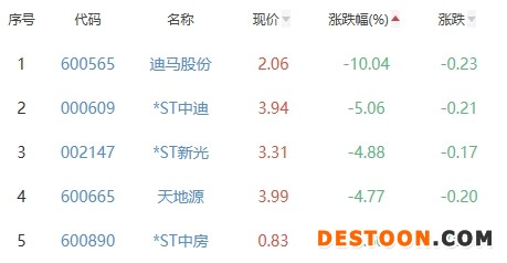 迪马股份、*ST中迪、*ST新光、天地源、*ST中房位列涨幅榜后五位,涨幅分别为-10.04%、-5.06%、-4.88%、-4.77%、-4.60%。