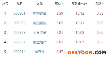 其中,中南建设、南国置业、华发股份、信达地产、渝开发位列板块涨幅前五位,涨幅分别为10.12%、10.11%、10.08%、10.07%、10.06%。