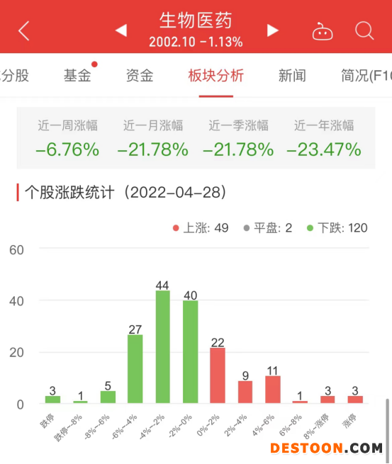 中国经济网北京4月28日讯 今日,生物医药板块整体跌幅1.13%,其中49只股票上涨,2只股票平盘,120只股票下跌。