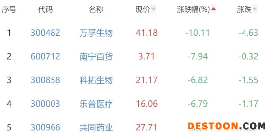 万孚生物、南宁百货、科拓生物、乐普医疗、共同药业位列涨幅榜后五位,涨幅分别为-10.11%、-7.94%、-6.82%、-6.79%、-6.64%。