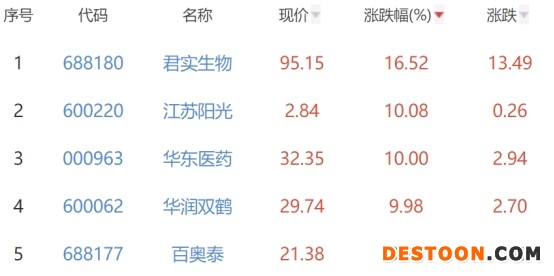 其中,君实生物、江苏阳光、华东医药、华润双鹤、百奥泰位列板块涨幅前五位,涨幅分别为16.52%、10.08%、10.00%、9.98%、9.25%。