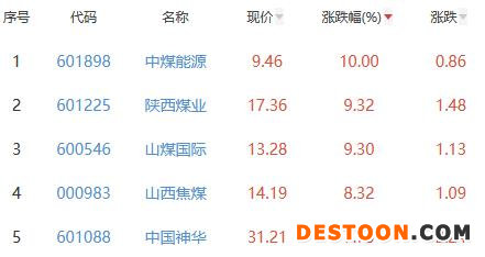 其中,中煤能源、陕西煤业、山煤国际、山西焦煤、中国神华位列板块涨幅前五位,涨幅分别为10.00%、9.32%、9.30%、8.32%、7.73%。