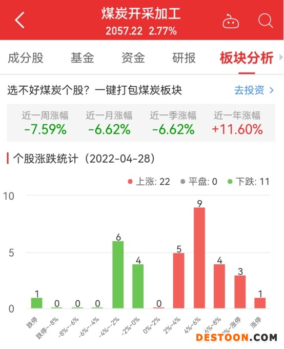 中国经济网北京4月28日讯 今日,煤炭开采加工板块整体涨幅2.77%,其中22只股票上涨,0只股票平盘,11只股票下跌。