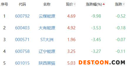 云煤能源、大有能源、ST大洲、辽宁能源、陕西黑猫位列涨幅榜后五位,涨幅分别为-9.98%、-3.53%、-3.45%、-3.27%、-2.71%。