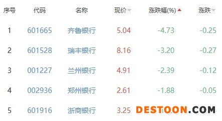 齐鲁银行、瑞丰银行、兰州银行、郑州银行、浙商银行位列涨幅榜后五位,涨幅分别为-4.73%、-3.20%、-2.39%、-1.88%、-1.22%。