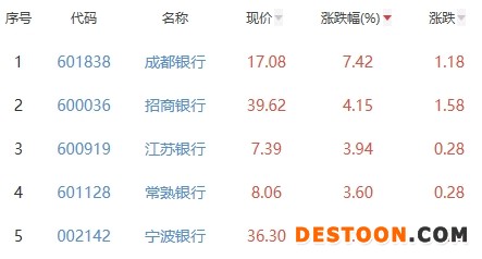 其中,成都银行、招商银行、江苏银行、常熟银行、宁波银行位列板块涨幅前五位,涨幅分别为7.42%、4.15%、3.94%、3.60%、3.48%。