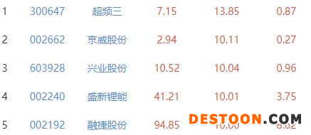 其中,超频三、京威股份、兴业股份、盛新锂能、融捷股份位列板块涨幅前五位,涨幅分别为13.85%、10.11%、10.04%、10.01%、10.00%。
