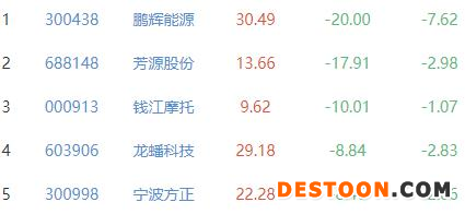 鹏辉能源、芳源股份、钱江摩托、龙蟠科技、宁波方正位列涨幅榜后五位,涨幅分别为-20.00%、-17.91%、-10.01%、-8.84%、-8.46%。
