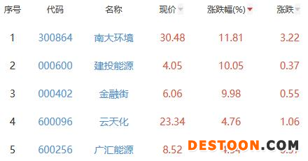 其中,南大环境、建投能源、金融街、云天化、广汇能源位列板块涨幅前五位,涨幅分别为11.81%、10.05%、9.98%、4.76%、4.54%。