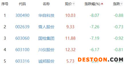 华自科技、雪人股份、国检集团、川仪股份、诚邦股份位列涨幅榜后五位,涨幅分别为-8.07%、-7.26%、-7.19%、-6.17%、-6.07%。